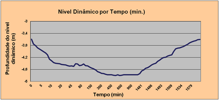 Com os dados obtidos o Geólogo elabora o relatório e atesta a sustentabilidade do poço para aquele equipamento (potência e vazão) de extração (por bomba submersível, autoaspirante ou centrífuga) instalado; gerando gráficos do comportamento do nível de água como abaixo.